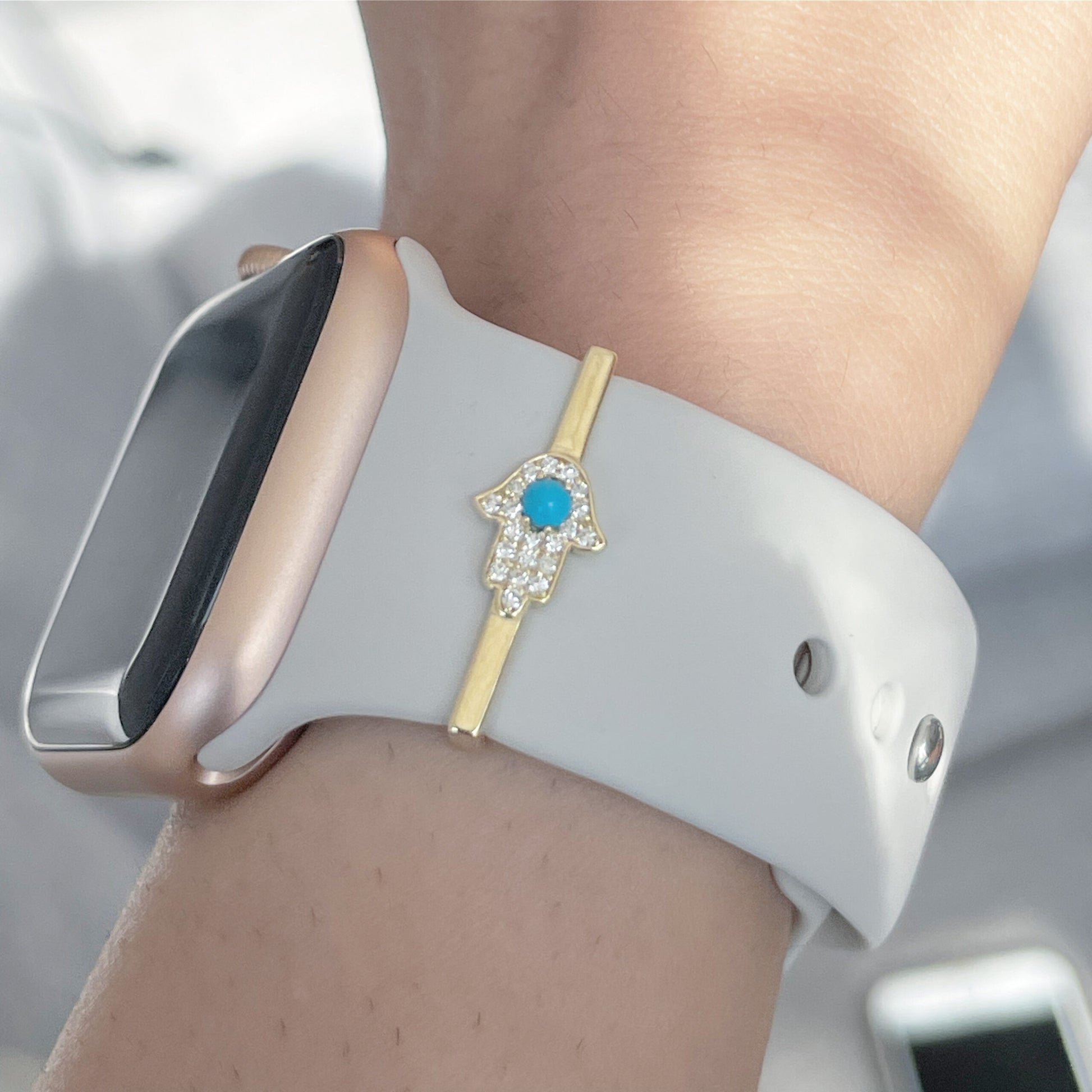 Accessorise your smart watch with a diamond hamsa hand charm, with a turquoise centre gemstone. Fits both S/M and M/L silicone straps for Apple Watch.