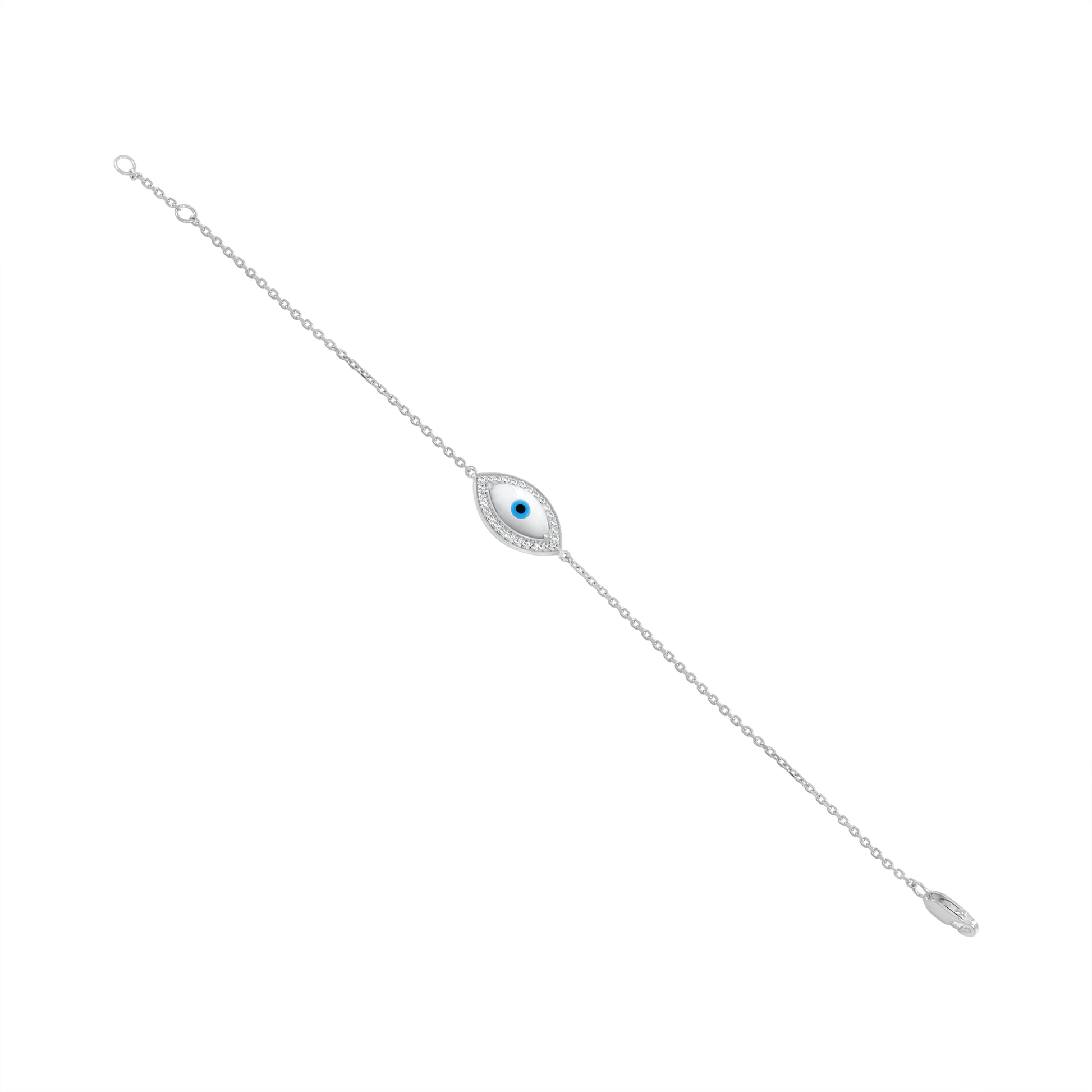 Protect yourself in style with our marquise-shaped mother of pearl evil eye bracelet with a diamond bezel.