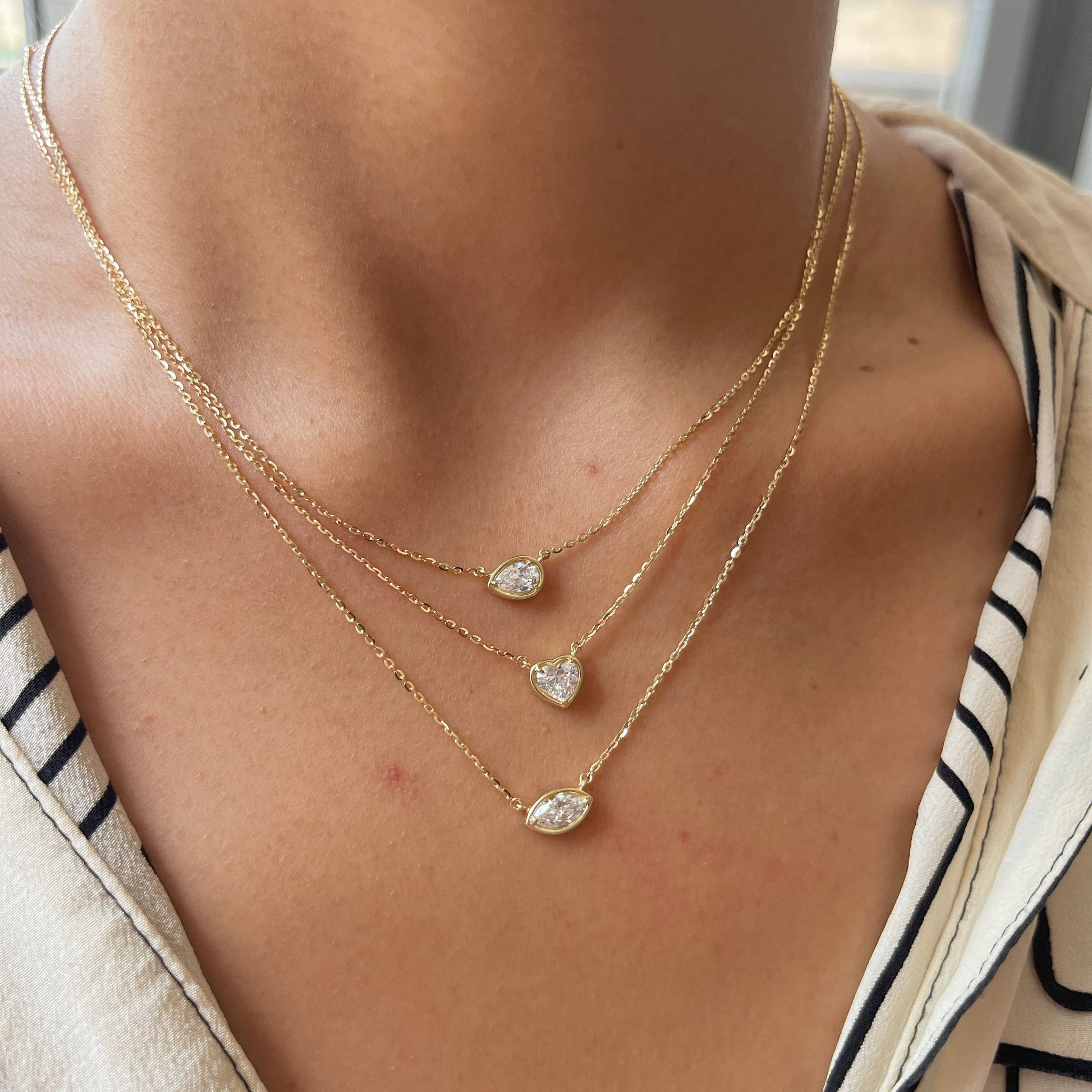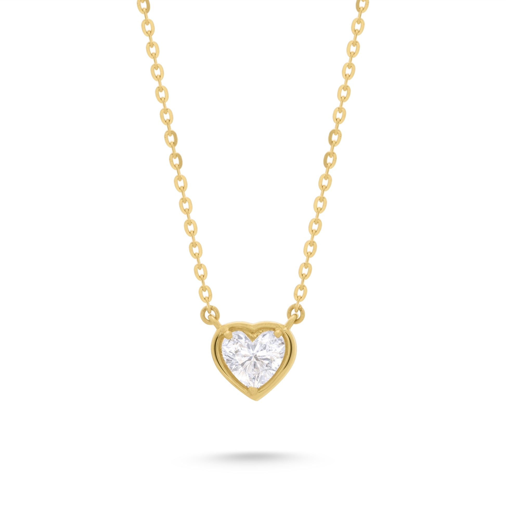 Celebrate love with timeless elegance. This delicate necklace features a 0.50 carat heart-shaped lab-grown diamond, bezel-set in 18k gold for a sleek, modern finish. The bezel setting securely encases the diamond while enhancing its natural brilliance and unique heart shape. Suspended from a fine gold chain, this piece blends romantic symbolism with everyday sophistication — perfect for marking meaningful moments or wearing as a personal statement of love.