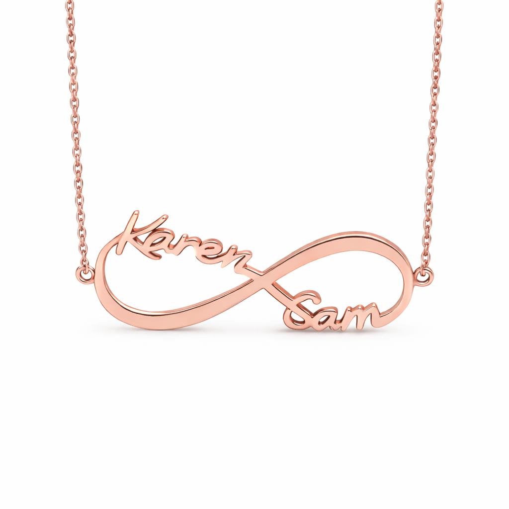 Two names in script tied together in a beautiful infinity symbol. Pendant width 30mm.